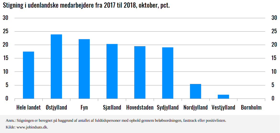 Det er samtidig hele landet, der nyder godt af den fortsatte tilgang. I alle RAR-områder på nær Bornholm er der i dag flere udenlandske medarbejdere, der er kommet hertil gennem beløbsordningen, fasttrack-ordningen eller via positivlisten, end der var for et år siden. Det seneste år er antallet af fuldtidspersoner på de ordninger steget med ca. 1.200.