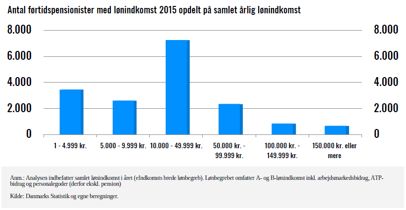 Nye beregninger foretaget på baggrund af tal fra Danmarks Statistik viser, at der i 2015 var godt 17.000 førtidspensionister med lønindtægt svarende til ca. 8 procent af det samlede antal førtidspensionister