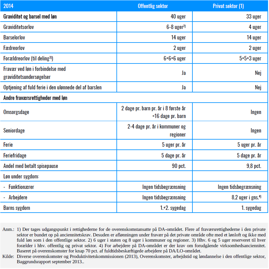 Forskellen i antallet af dage med betalt fravær i de to sektorer afspejler blandt andet forskelle i prioriteringer i forbindelse med overenskomstforhandlinger. I den offentlige sektor har man eksempelvis vedtaget omsorgsdage til personer med børn og seniordage til personer over en vis alder. Sådanne dage findes ikke på DA-området. Samtidig har offentligt ansatte op til 40 ugers barsel med løn sammenlignet med 33 uger på DA-området, hvilket alt andet lige tilskynder til en større barselsudnyttelsesgrad end på DA-området, jf. tabellen nedenfor.